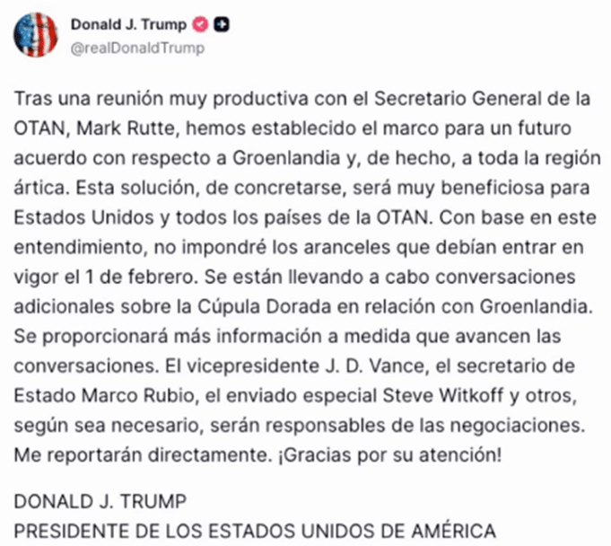 “Hemos establecido el marco para un futuro acuerdo con respecto a Groenlandia y, de hecho, a toda la región ártica”, publicó Trump ayer en la tarde en Truth Social. “Con base en este entendimiento, no impondré los aranceles que estaban programados para entrar en vigor el 1 de febrero.”